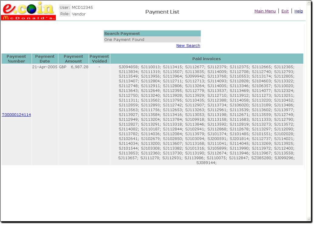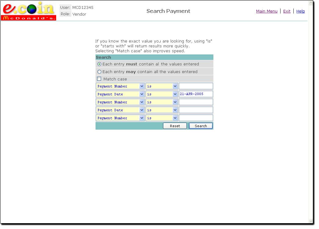 A payment search requires specifying a value or a range of values for one or more of the following field names (you are restricted to viewing only payments made to your company):