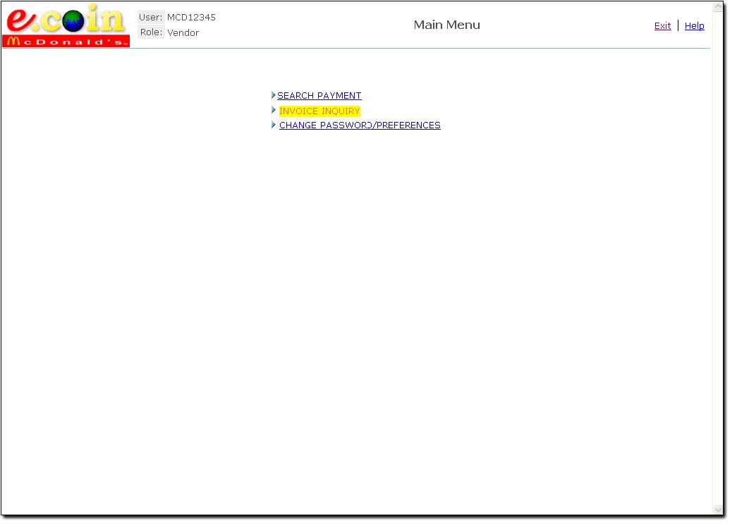 Invoice Inquiry allows you to search for and view past invoices. From the main menu select the second option INVOICE INQUIRY; this will open the Search Invoice page where you can enter your search criteria.