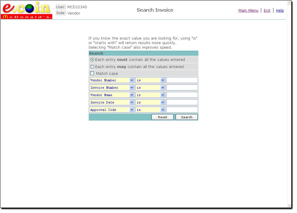 The option above Match Case only applies if you are searching on more than one field. Selecting the option Each entry must contain all the values entered will limit the search results to only invoices that match all criteria The second option will show any invoices that match one or more of your criteria.