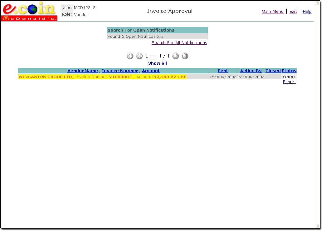 Once you have the results from your search you can then look at the details behind the invoice and also view the history of its movement through the ECoin system. To do this, click on the item of interest (shown below highlighted in yellow).