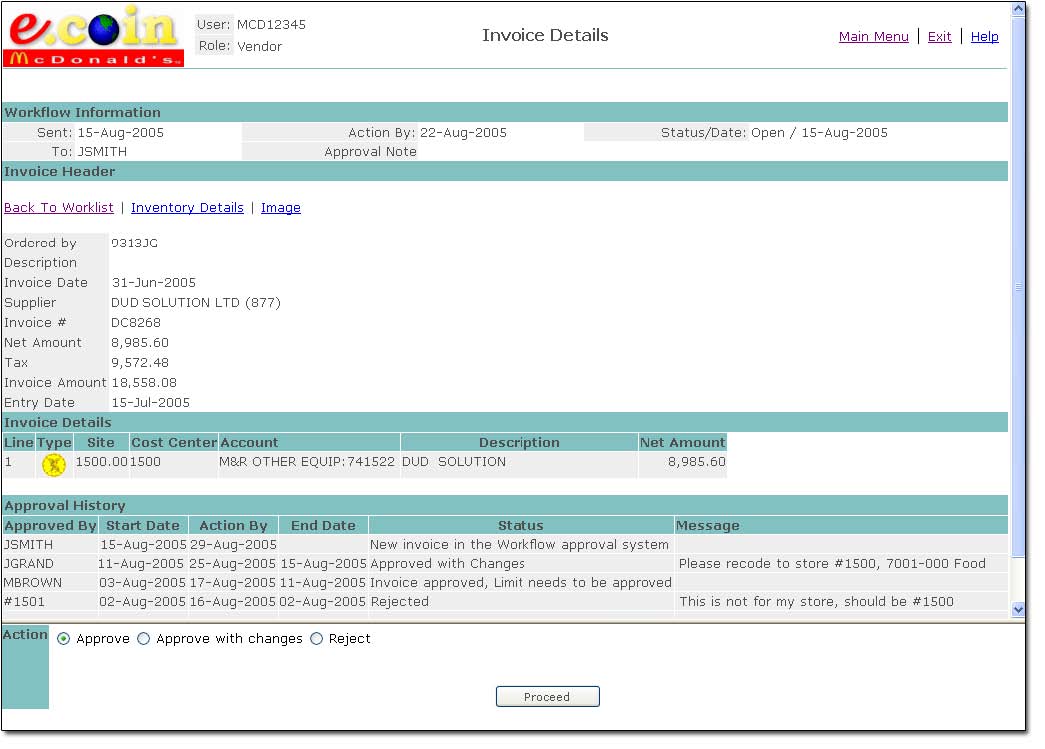 Approval History section shows the history of the invoice as it has progressed through the ECoin system. It contains the following fields: